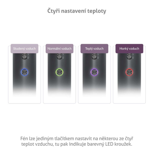 Tlačidlo fénu je vybavené farebným LED krúžkom, ktorý zobrazuje aktuálne nastavenú teplotu. Studený vzduch označuje modrá farba, normálny vzduch zelená, teplý vzduch fialová a horúci vzduch červená farba.