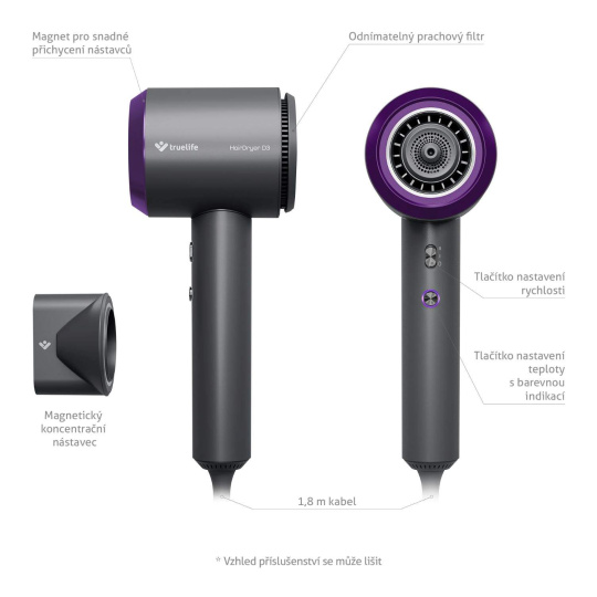 Fén TrueLife D3 pracuje rýchlosťou až 20 000 otáčok za minútu vďaka výkonnému motoru s technológiou TrueLife UltraFlow® a o vaše vlasy sa postará ako profesionálny kaderník. Ku krásnym a zdravým vlasom prispieva aj ionizátor s technológiou TrueLife UltraIonic®, ktorý vyžaruje približne 40 miliónov záporných iónov pôsobiacich až do vnútra vlasov. Vlasy vďaka tomu vysušíte za kratší čas a pri nižšej teplote, ktorej aktuálne nastavenie indikuje farebný LED krúžok okolo tlačidla. Modrá farba označuje studený vzduch, zelená normálny, fialová teplý a červená horúci.