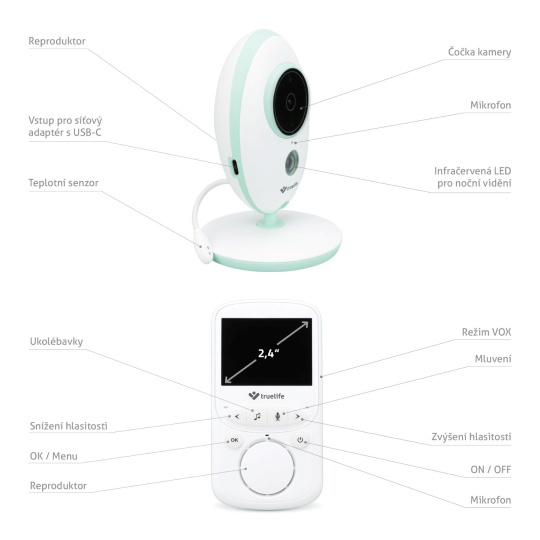 Obľúbená pestúnka, overená zákazníkmi, TrueLife NannyCam V24 vo vylepšenej verzii je tu. TrueLife NannyCam V24 Pro je digitálna video opatrovateľka s prehľadným farebným 2,4 palcovým LCD displejom, izbovým teplomerom, automatickým nočným módom a moderným USB-C pripojením pre rýchle a spoľahlivé nabíjanie. Prenos zvuku aj obrazu je vysoko kvalitný vo dne aj v noci. Môžete byť v pokoji a mať istotu, že je s Vašimi blízkymi všetko v poriadku, pretože použitá digitálna technológia s frekvenciou 2.4 GHz zaručuje bezpečný a stabilný signál.