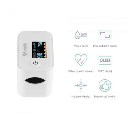 Pulzný oxymeter Truelife X3 je malý praktický prístroj, s ktorým ľahko, okamžite a bezbolestne zistíte saturáciu krvného hemoglobínu kyslíkom, tepovú frekvenciu a perfúzny index. Malý prístroj, ktorý jednoducho umiestnite na prst, je ideálnym pomocníkom pre osoby s respiračnými ochoreniami, srdcovými problémami, astmatici, ale aj vrcholových športovcov. Oxymeter je vybavený OLED displejom, ktorý zobrazuje namerané hodnoty. Displej ponúka nastaviteľnú intenzitu jasu a 6 režimov zobrazenia meraných hodnôt. Oxymeter TrueLife X3 spoľahlivo zmeria váš tep aj saturáciu krvi kyslíkom v pohodlí domova, bez nutnosti návštevy lekára a bez bolesti.