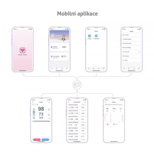 Oximeter disponuje prehľadným OLED displejom, ktorého nastavenie je možné prispôsobiť podľa vašich preferencií. Na výber je 6 možností zobrazenia meraných hodnôt. Môžete si nastaviť aj preferovanú intenzitu jasu, zvukový indikátor, či zvukový doprovod tepu. Vďaka zabudovanému Bluetooth je možné oximeter spárovať so smartfónom. Namerané hodnoty máte uložené v aplikácii, ktorá je v češtine, a ich históriu tak máte neustále pri sebe a môžete ju zdieľať s lekármi alebo rodinou. Vývoj merania vidíte v aplikácii na prehľadnom grafe.