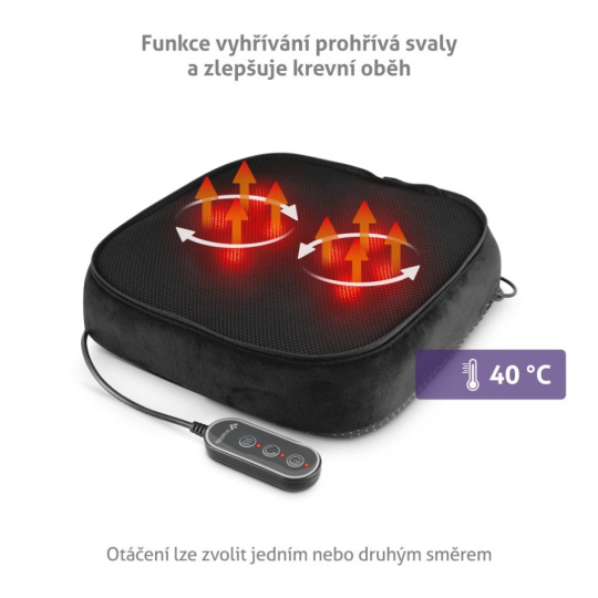 Prístroj je vybavený ovládačom s intuitívnym ovládaním jednotlivých funkcií, vďaka ktorému je možné zvoliť kombináciu masáže s vyhrievaním či samostatne a otáčanie hlavíc jedným alebo druhým smerom. Protišmyková podložka zaisťuje, že prístroj zostane na svojom mieste a jediné, čo sa otáča, sú dve rotačné hlavice s ôsmimi nahrievacími masážnymi uzlami. Masáž trvá ideálnych 15 minút, po uplynutí ktorých časovač prístroj automaticky vypne. Údržbu vrchného a spodného microfleecového povlaku zjednodušuje možnosť zloženia a prania v práčke.