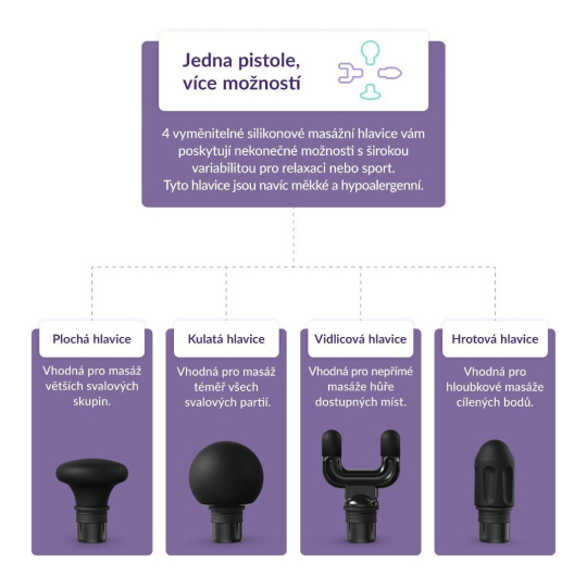 Balenie obsahuje 4 výmenné silikónové masážne hlavice a každá má svoje špecifické odporúčané použitie. Silikónové hlavice sú oproti tým klasickým plastovým mäkké, hypoalergénne a príjemné.
