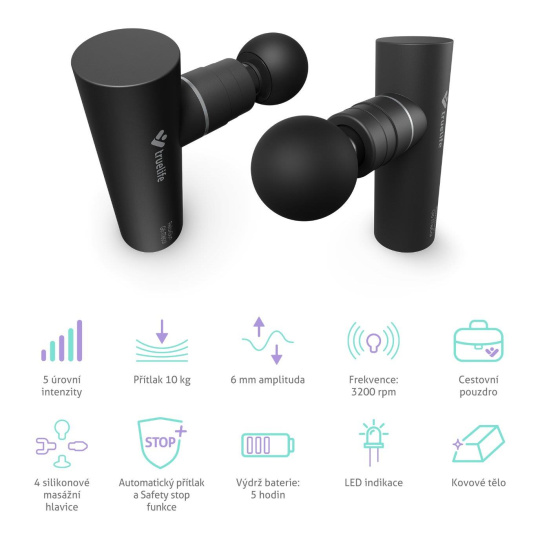 Príjemná masáž po športe aj sedavom zamestnaní, ktorá napomôže od bolesti a stuhnutosti svalov, sa občas hodí každému. Nie vždy je ale možné zájsť k masérovi, preto TrueLife prináša jedného až k vám domov. Masážna pištoľ RelaxGun G6 Metal je vždy pripravená sa o vás postarať. Jej 5 intenzít napomôže regenerácii svalov, zmierneniu napätia, zlepšeniu krvného obehu a uľaví od stresu. Pištoľ vďaka svojím malým rozmerom neváži takmer nič, ľahko sa s ňou teda manipuluje, ukrýva však veľký výkon - silu prítlaku 10 kg. Amplitúda je 6 mm a prístroj vykoná až 3200 kmitov za minútu. K dispozícii sú 4 vymeniteľné silikónové hlavice a šikovné bezpečnostné funkcie Automatic pressure a Safety stop. Masážna pištoľ pracuje veľmi ticho a jej dobíjacia lítiová batéria zvládne prevádzku až 5 hodín. Hliníkové telo nielen dobre vyzerá, ale predovšetkým vydrží. Masáž si môžete dopriať aj na cestách, pištoľ stačí vložiť do priloženého cestovného puzdra.