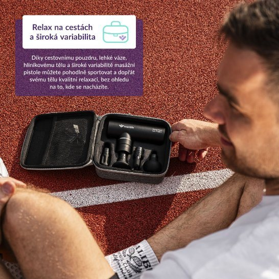Masážna pištoľ s vami môže cestovať kamkoľvek, stačí ju zabaliť do priloženého cestovného puzdra.