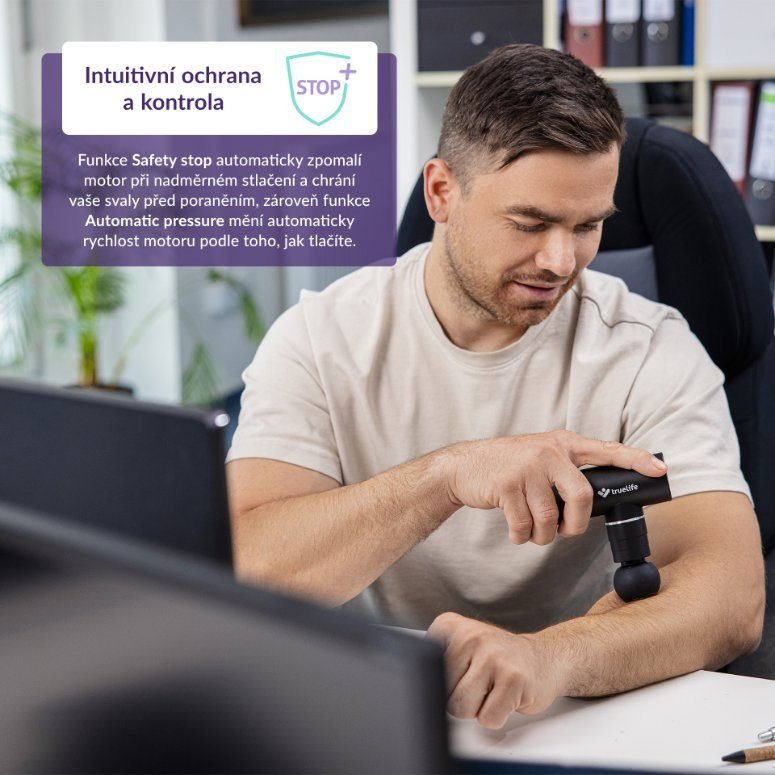 Masáž je možné vykonávať bez obáv v pohodlí domova. Funkcia Automatic Pressure postráži vyvíjaný tlak a prispôsobuje mu frekvenciu pohybov. Čím viac zatlačíte, tým viac sa zrýchlia pohyby. Funkcia Safety Stop zas automaticky spomalí motor, pokiaľ pri masáži zatlačíte až príliš. Môže prísť až k úplnému vypnutiu, aby sa predišlo zraneniu. Použitie je veľmi jednoduché, na ovládanie stačí jedno tlačidlo. Po 15 minútach používania sa pištoľ automaticky vypne. Malé a odolné hliníkové telo ukrýva dobíjaciu lítiovú batériu, ktorá vydrží až 5 hodín činnosti. Pri masáži nebudete nikoho rušiť, prevádzka je veľmi tichá .