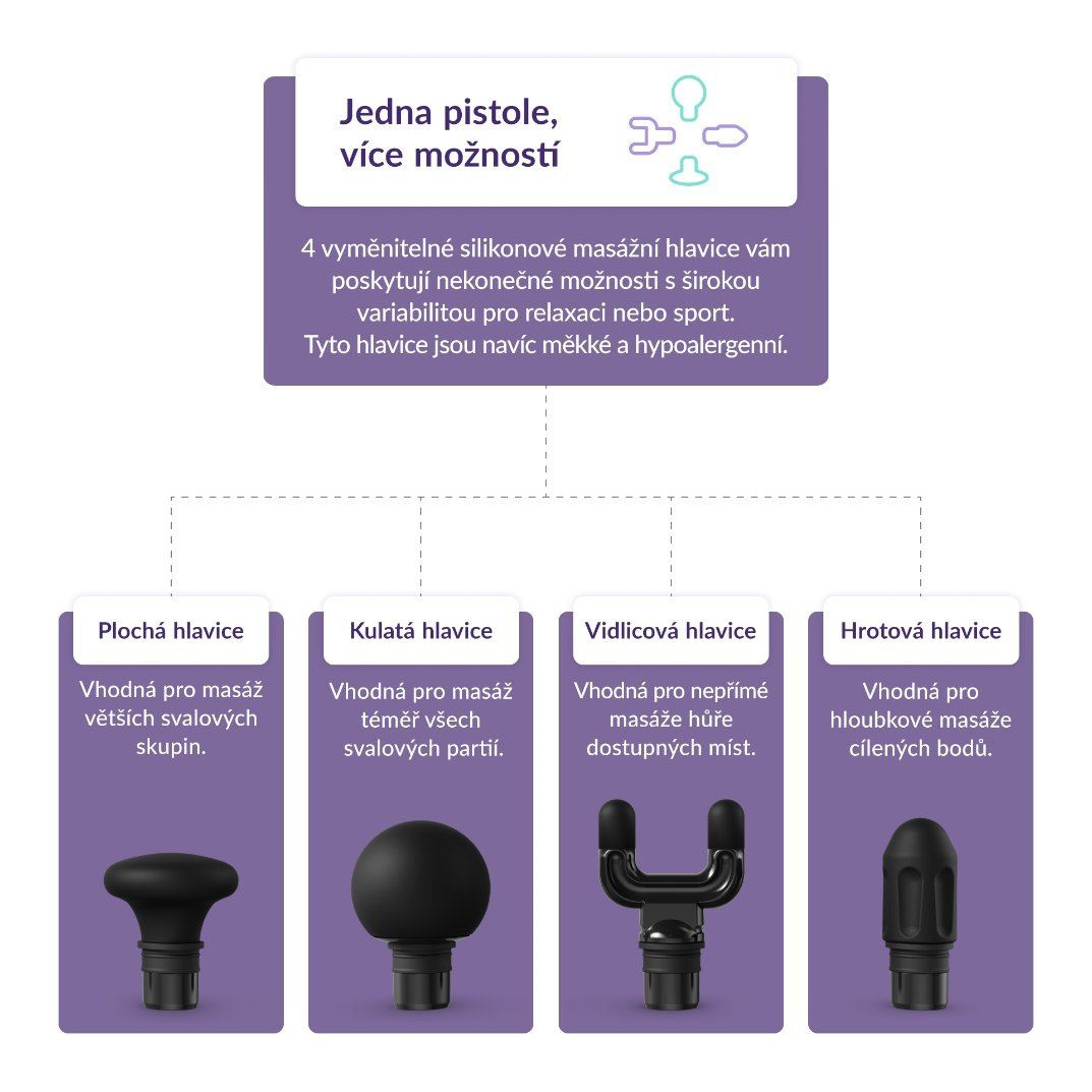 Balenie obsahuje 4 výmenné silikónové masážne hlavice a každá má svoje špecifické odporúčané použitie. Silikónové hlavice sú oproti tým klasickým plastovým mäkké, hypoalergénne a príjemné.