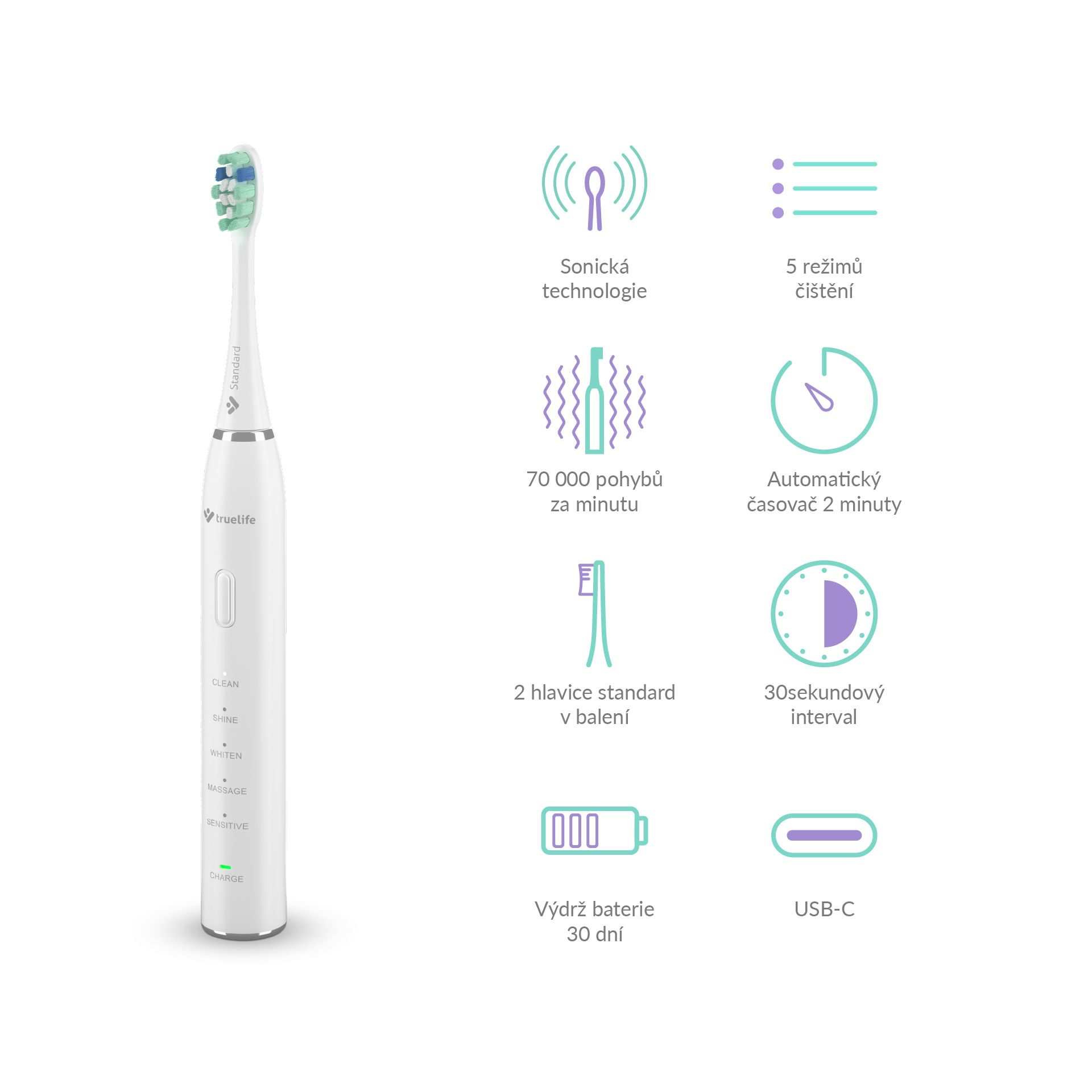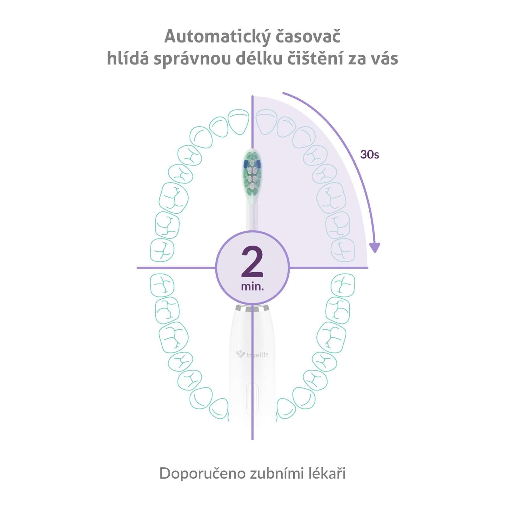 Sonická technológia predstavuje účinný spôsob boja proti zubnému povlaku. Oproti rotačným kefkám je šetrnejšia k zubnej sklovine a vírením vody s pastou pomáha čistiť aj medzizubné priestory. Technológia SonicTrue® funguje na báze jemných vibrácií a oproti manuálnej kefke, s ktorou urobíte približne 600 pohybov za minútu, zvládne TrueLife SonicBrush Clean30 za jednu minútu až 70 000 pohybov pre žiarivý úsmev bez námahy. Hlavica kefky vydrží až 3 mesiace používania, potom sa štetiny začnú strapkať, strácajú účinnosť a navyše sa na nich hromadia baktérie. Našťastie sú hlavice opatrené modrými štetinami, ktoré po 3 mesiacoch vyblednú a vy tak viete, že je načase ich vymeniť.