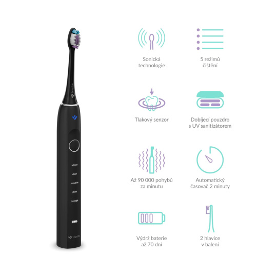 Stačí jediná kefka na riešenie rôznych problémov. Balenie sonickej kefky TrueLife SonicBrush Clean70 UV zahŕňa 2 hlavice. Štandard pre každodenné čistenie a Sensitive s extra jemnými štetinkami pre citlivé zuby. Dokúpiť je možné aj hlavicu Whiten na bielenie zubov. Hlavice však nie sú jedinými pomocníkmi pri starostlivosti o zuby a ďasná, svoju úlohu splní aj 5 režimov čistenia. So štandardným čistením si poradí režim Clean, o citlivé zuby a ďasná sa postará režim Sensitive, pre žiarivý lesk a odstránenie škvŕn od čaju a kávy použite režim Shine, na odstránenie odolného zubného plaku a vybielenie zubov slúži režim Whiten, ak chcete zlepšiť zdravie ďasien a stimulovať ich, je tým pravým režim Massage.