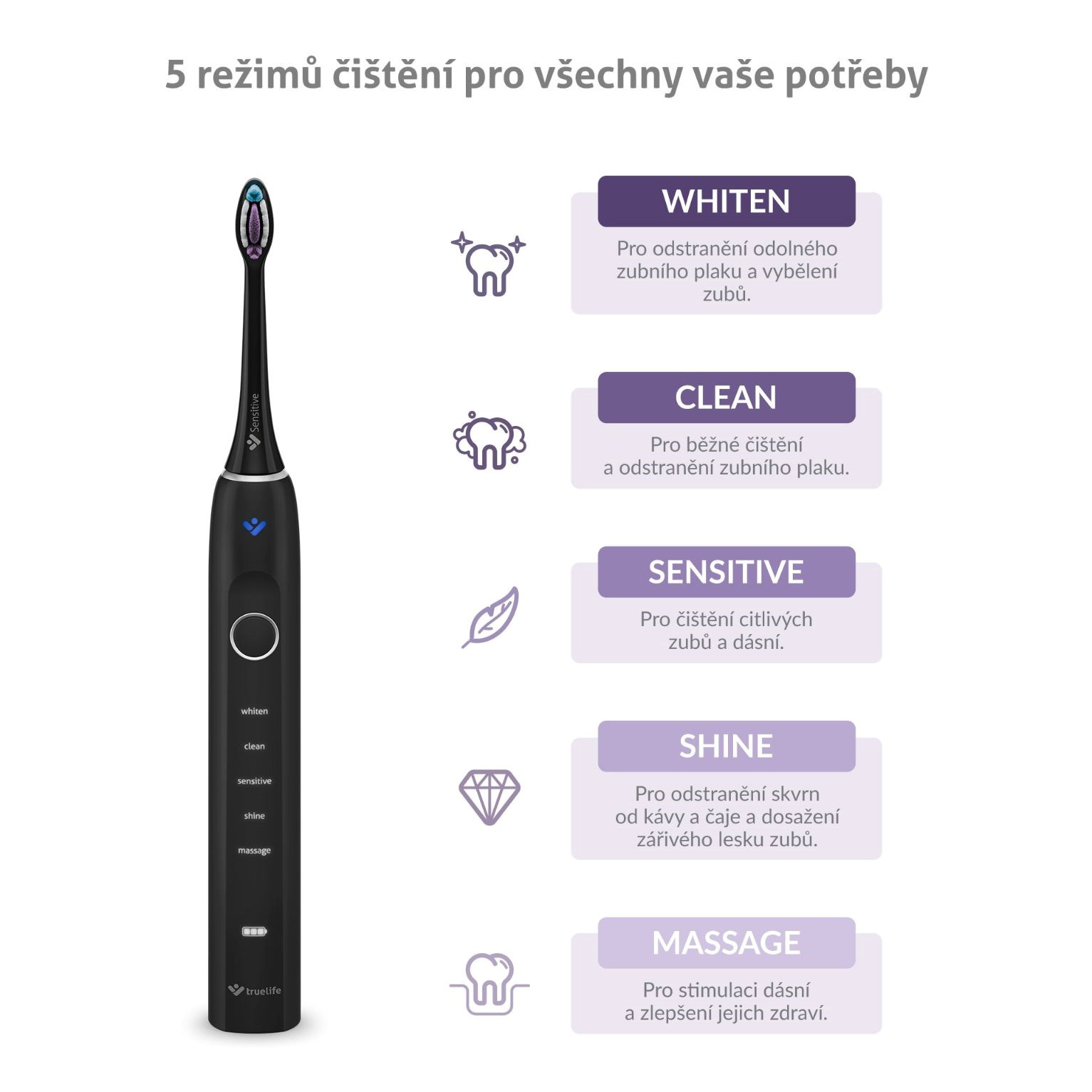 Stačí jediná kefka na riešenie rôznych problémov. Balenie sonickej kefky TrueLife SonicBrush Clean70 UV zahŕňa 2 hlavice. Štandard pre každodenné čistenie a Sensitive s extra jemnými štetinkami pre citlivé zuby. Dokúpiť je možné aj hlavicu Whiten na bielenie zubov. Hlavice však nie sú jedinými pomocníkmi pri starostlivosti o zuby a ďasná, svoju úlohu splní aj 5 režimov čistenia. So štandardným čistením si poradí režim Clean, o citlivé zuby a ďasná sa postará režim Sensitive, pre žiarivý lesk a odstránenie škvŕn od čaju a kávy použite režim Shine, na odstránenie odolného zubného plaku a vybielenie zubov slúži režim Whiten, ak chcete zlepšiť zdravie ďasien a stimulovať ich, je tým pravým režim Massage.