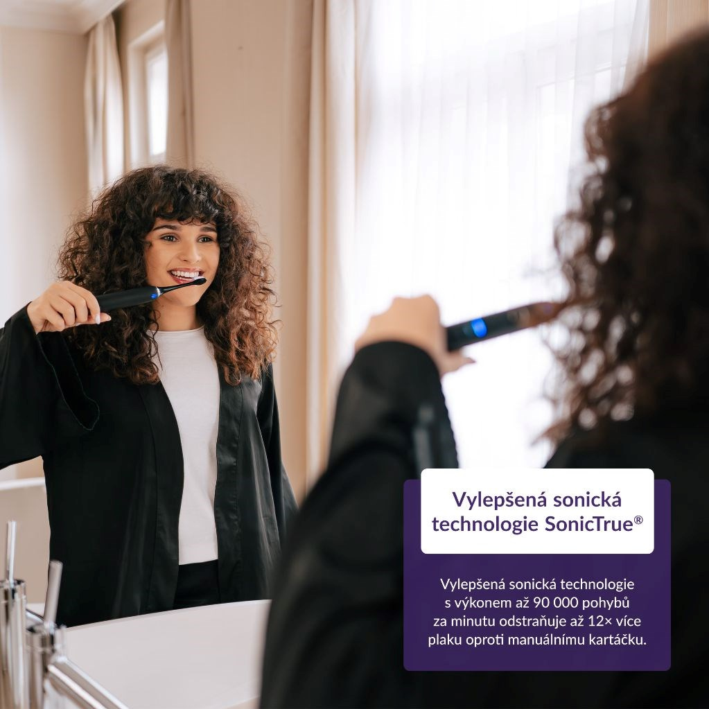 Vylepšená sonická technológia SonicTrue® pracuje na báze jemných vibrácií, čo vedie k šetrnému čistenia plôšky zubov a víreniu vody s zubnou pastou, ktoré vytvára mikrobublinky prenikajúce do medzizubných priestorov a ťažko dostupných miest.