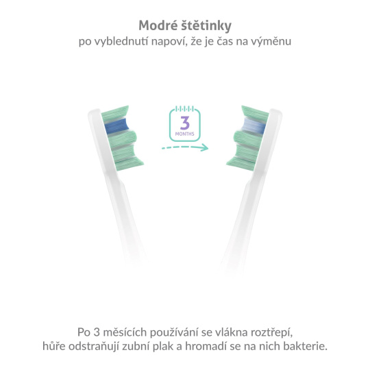 Stredne tvrdé štetiny náhradných hlavíc TrueLife SonicBrush Clean-Series Standard efektívne odstraňujú zubný povlak bez toho, aby dráždili ďasná, a zaisťujú tak šetrné a dôkladné čistenie. Modré štetiny postupne blednú a po troch mesiacoch vám jasne signalizujú, že je čas na výmenu hlavice. Vďaka tomuto šikovnému indikátoru máte istotu, že vaše čistenie zostáva vždy maximálne účinné.