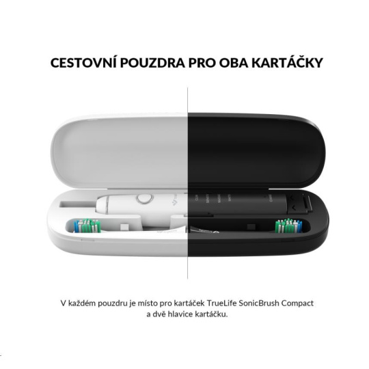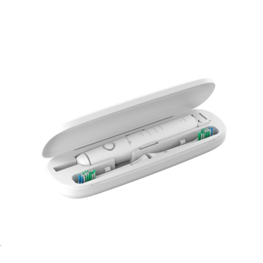 Telá kefiek sú kompaktné a veľmi ľahké. 30-dňová výdrž batérie kefiek vám zabezpečí, že nemusíte na cestách riešiť nabíjanie. Dve cestovné púzdra v bielej a čiernej farbe, zaručia bezpečné a hygienické uloženie kefky.