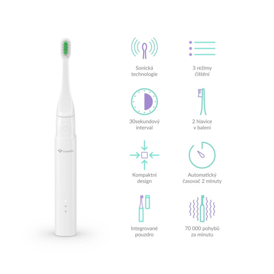 Chcete mať zdravé zuby a ďasná? Na kefku TrueLife s modernou sonickou technológiou SonicTrue® sa môžete spoľahnúť. Hlava kefky kmitá rýchlosťou 70 000 pohybov za minútu a každým pohybom odstráni maximum zubného povlaku. Zároveň je sonická technológia šetrná k zubnej sklovine. Praktické puzdro je súčasťou tela kefky a batéria vám vydrží nabitá až 21 dní. Súčasťou balenia sú 2 hlavice Standard.
