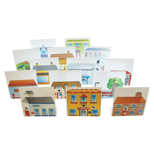 Balíček okolia pre Bee-Bot & Blue-Bot robota. Vybuduj si vlastné mesto pre Bee-Bota alebo Blue-Bota. Balíček obsahuje podložku, pouličné lampy, stromy, budovy a 22 drevených kusov pouličného nábytku.