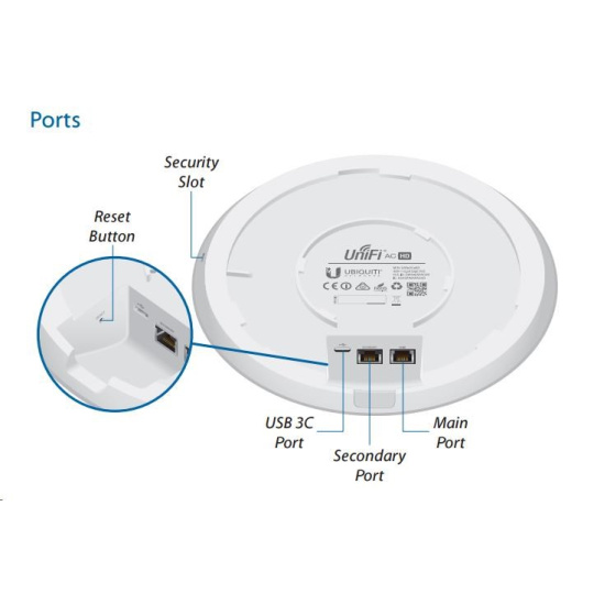 uniFi AP AC HD je prvým zariadením 802.11ac wave2 AP od Ubiquiti s celkovou priepustnosťou až 2533Mbps (2.4GHz 800Mbps + 5GHz 1733Mbps), má 4x4 MU-MIMO všesmerové dvojpásmové polarizácie. 3dBi antény pre 2.4GHz a 4dBi pre 5GHz s rádiovým výkonom do 25dBm pre obe frekvencie 2.4 a 5GHz súčasne. Podporuje 802.11a/b/g/n/ac/ac wave2, má dve gigabitové.ethernet. porty (druhý je v mostíku). Môže byť napájaný prostredníctvom aktívneho PoE podľa 802.3at alebo pasívne (48 V DC), adaptér PoE je súčasťou dodávky (pasívne). Maximálna spotreba energie je 17 W.