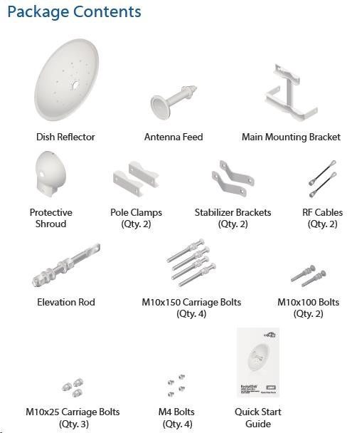 dvojpolarizačná 5GHz anténa so ziskom 30 dBi vhodná pre jednotku Rocket M5. Využíva horizontálnu aj vertikálnu polarizáciu, čím nahrádza dve samostatné antény a šetrí náklady na prenájom miesta pre anténu. Anténa je vhodná na jednoduché vytváranie spojení PtP. Dodáva sa aj s vodotesným príslušenstvom na pripojenie k jednotke Rocket M5.