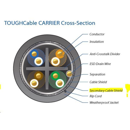 tOUGHCable CARRIER je špeciálne navrhnutý tienený kábel SFTP. Na rozdiel od kábla TOUGHCable PRO má okolo hliníkovej fólie kovové opletenie, podobne ako koaxiálne káble pre SAT/TV technológiu - zvyšuje odolnosť voči prípadnému rušeniu. Kábel Cat5e na extrémne nasadenie v najťažších poveternostných podmienkach, ktorý podstatne eliminuje riziko poškodenia vonkajších aktívnych komponentov elektrostatickým výbojom.