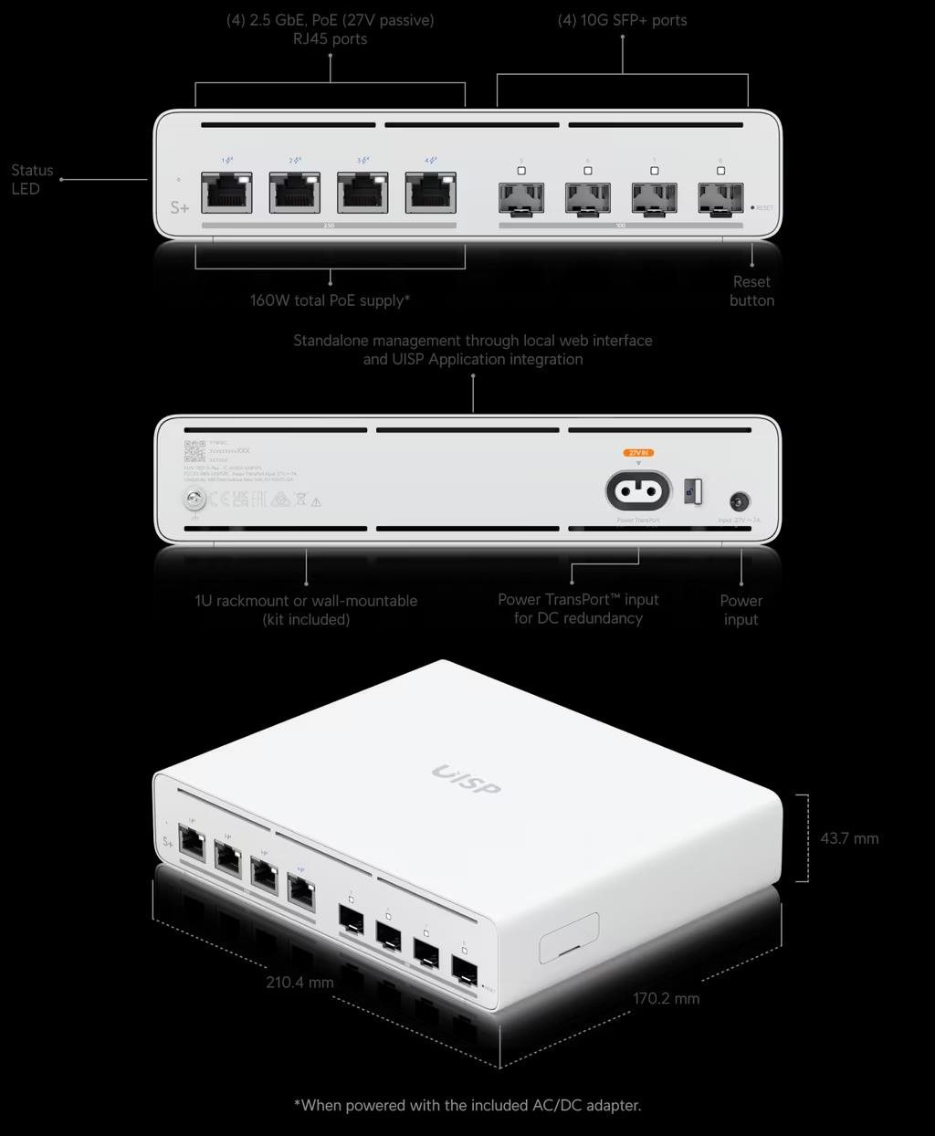 2.5 GbE PoE switch for ISP applications. (4) 2.5 GbE RJ45 ports with 27V passive PoE output (4) 10G SFP+ ports 160W (27V) total PoE availability*, 20W/port (2-pair) / 40W/port (4-pair) Port isolation, speed limiting, and DHCP snooping functionality (1) Power TransPort™ input for DC redundancy Desk, wall, 1U rack, and outdoor** mounting Standalone management through local web interface and UISP Application integration *When powered with the included AC/DC adapter. **When enclosed in the UISP Box Plus (sold separately)..