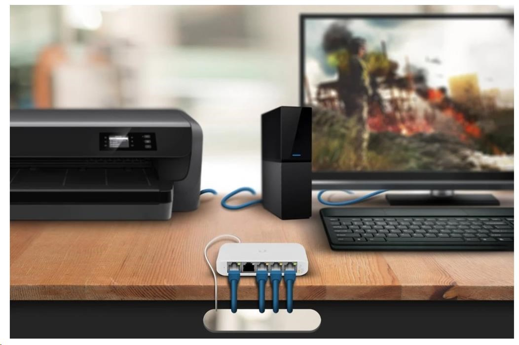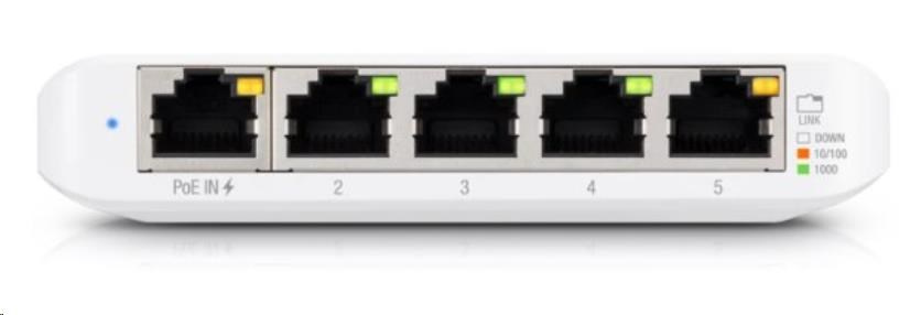 USW-Flex-Mini je malý 5-portový gigabitový prepínač so správou UniFi Controller od spoločnosti Ubiquiti Networks v stolnom vyhotovení s prvým portom podporujúcim PoE In.