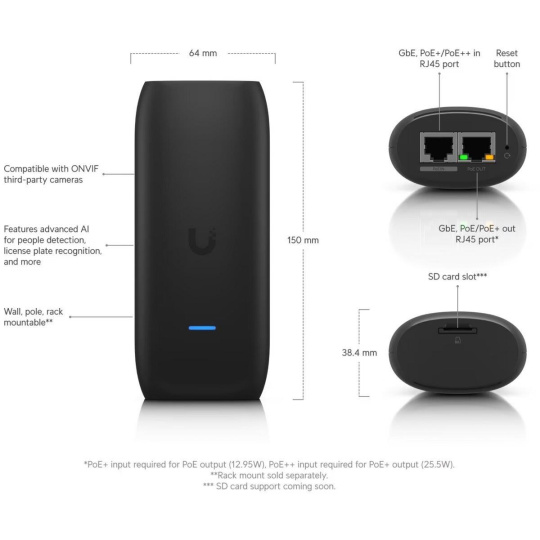 Popis produktu AI zařízení, které rozšiřuje funkce jakékoliv UniFi Protect kamery nebo kamery třetí strany o schopnosti detekce, klasifikace a rozpoznávání pomocí umělé inteligence. Zařízení lze montovat na stěnu nebo trubku s průměrem alespoň 45mm Každý AI-Port podporuje právě 1 kameru třetí strany nebo kameru UniFi Protect G3/G4/G5. V budoucí verzi firmware bude podporováno více kamer. Kamera nemusí být připojena přímo do AI-Portu, je potřeba aby byla ve stejné síti LAN a páruje se s AI-Port v aplikaci Protect. AI-Port je možné napájet přes vstupní POE 802.3af/at/bt. V případě vstupního napájení 802.3at lze navíc využít PoE výstup s výkonem až 12.95W, v případě vstupního napájení 802.3bt lze využít výstup s výkonem až 25.5W. AI-Port přináší do všech kamer AI funkce: • Detekce: Pohyb, člověk, vozidlo, domácí mazlíček, řeč • Klasifikace: Barva vozidla, typ vozidla • Rozpoznání: Obličej, registrační značka Podpora více kamer * • ONVIF 2K: až 2 kamery • ONVIF HD: až 3 kamery • UniFi Protect: až 5 kamer * podpora více kamer je plánovaná v budoucí verzi firmware Obsah balení • Zařízení • Držák na zeď / trubku • (2) Stahovací pásky • (2) Vruty a hmoždinky Technické parametry Napájení Napájení přes PoE:Ano Počet PoE In portů:1 Typy PoE:PoE-Out + PoE-In Podporované PoE-Out standardy:802.3af, 802.3at Počet PoE Out portů:1 Fyzické charakteristiky Tlačítka:Reset Provozní teplota [°C]:-20 až 40 Hmotnost [g]:258 Šířka [mm]:64 Výška [mm]:150 Hloubka [mm]:38.