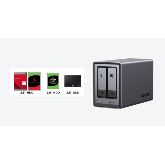 UGREEN NAS je kompatibilný s extrémne širokou škálou úložných diskov, vrátane 3,5„/2,5“ SATA diskov a M.2 SSD. Podporované sú všetky najobľúbenejšie značky pevných diskov a neexistuje žiadne obmedzenie na konkrétneho výrobcu.