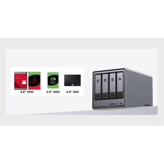 UGREEN NAS je kompatibilný s mimoriadne širokou škálou úložných diskov, vrátane 3,5"/2,5" SATA diskov a M.2 SSD. Podporované sú všetky najobľúbenejšie značky pevných diskov a neexistuje žiadne obmedzenie na konkrétneho výrobcu.