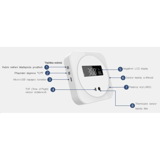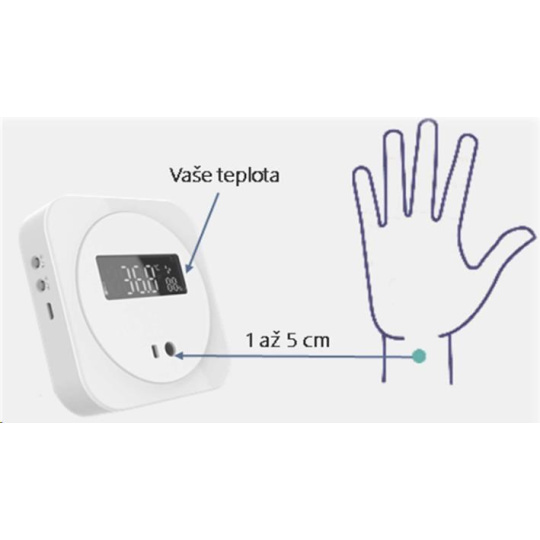 OHE-TWP02-D je veľmi jednoduché zariadenie, ktoré sa používa na rýchle orientačné meranie teploty na zápästí. Terminál je možné prevádzkovať v troch rôznych režimoch prevádzky - Automatický - Režim merania teploty a vlhkosti prostredia - Režim merania telesnej teploty. Terminál má dva snímače teploty a jeden snímač vlhkosti na zabezpečenie správnej funkčnosti. Ak je zvolený automatický režim, terminál sa okamžite prepne, ak sa vyžaduje meranie telesnej teploty na základe integrovaného snímača ToF (Time of Flight). Senzor ToF detekuje spektrum infračerveného žiarenia vyžarovaného z povrchu ľudského tela. OHE-TWP02-D-S31 je určený pre vnútorné aplikácie s nízkym počtom osôb, ako sú obce, kancelárie, domácnosti atď. Môže sa prevádzkovať len vo vnútornom tepelne a emisne stabilnom prostredí mimo prievanu a poveternostných podmienok. Nie je určený na meranie osôb bezprostredne po príchode z vonkajších priestorov (z veľmi chladných alebo teplých oblastí). V prípade príchodu z vonkajších priestorov sa odporúča počkať 1 minútu v miestnosti s terminálom, aby sa stabilizovala teplota povrchu tela. Zariadenie nemá pravidelnú automatickú rekalibráciu snímača s okolitým prostredím. Preto nemôže nahradiť profesionálne vstupné systémy s meraním teploty. Zariadenie sa dodáva bez napájania USB, iba s napájacím káblom microUSB-USB...