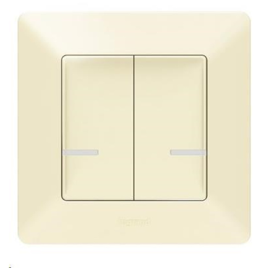 Valena Life s dvojitým bezdrôtovým spínačom osvetlenia Netatmo (batéria CR2032 a obojstranná lepenka sú súčasťou balenia) na ovládanie až 20 káblových zariadení (vypínačov/stmievačov, zásuviek, mobilných zásuvkových adaptérov, káblových zásuviek a osvetľovacích mikromodulov). Zadná strana je úplne plochá (možno ju pripevniť na stenu, sklo, nábytok pomocou skrutiek alebo obojstrannej lepenky) - farba béžová, dodáva sa s rámom v béžovej farbe