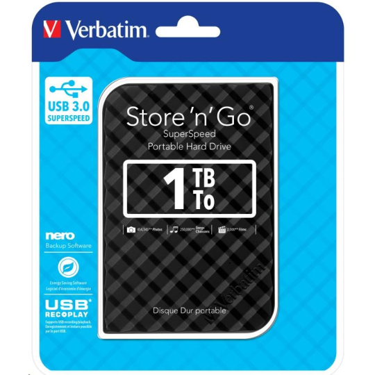 VERBATIM HDD 2.5" 1TB prenosný pevný disk Store 'n' Go USB 3.0, čierna Špeciálne funkcie: Dostupné farby: čierna, strieborná, biela, červená a modrá Dostupné kapacity: 500 GB, 1 TB a 2 TB Vysokorýchlostné úložisko s vysokou kapacitou. Rýchle a bezpečné riešenie na rozšírenie úložiska alebo zálohovanie súborov USB 3.0 SuperSpeed - pre veľmi rýchly prenos dát Nero Backup Software Softvér na úsporu energie USB REC & PLAY* - podporuje nahrávanie/prehrávanie cez USB 2 roky obmedzená záruka** Systémové požiadavky: PC alebo Mac s USB 3.0 Windows XP / Vista / Windows 7 a 8 Mac OS X 10.4 alebo vyššia Obsah balenia: Prenosný pevný disk / USB 3.0 Kábel / Nero Backup Software / Green Button Energy Saving Software / Verbatim Formatter / Quick Start Guide / User Guide (predinštalovaný na disku)..