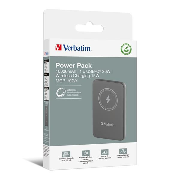VERBATIM Powerbanka Charge 'n' Go, Magnetická, 10000 mAh, USB-C, Šedá