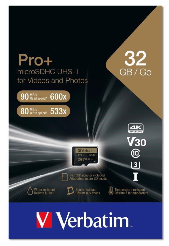 Pamäťové karty microSD Verbatim Pro+ umožňujú zachytávať video v najvyššom rozlíšení a poskytujú najvyšší výkon vašim akčným kamerám, videokamerám, smartfónom alebo tabletom.