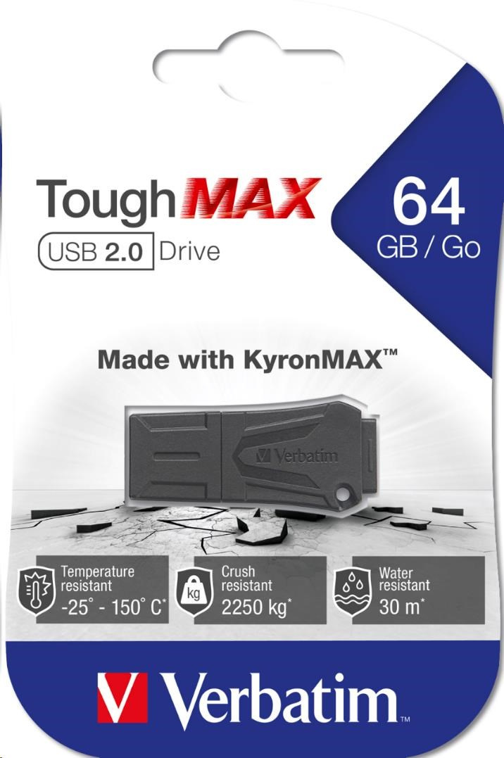 Zariadenie Verbatim ToughMAX USB 2.0 Drive je vyrobený zo zmesi KyronMAX™, termoplastického materiálu nahrádzajúceho kov, ktorý je schopný odolávať veľmi náročným podmienkam a používa sa v najnáročnejších aplikáciách od stíhačiek až po horské bicykle.