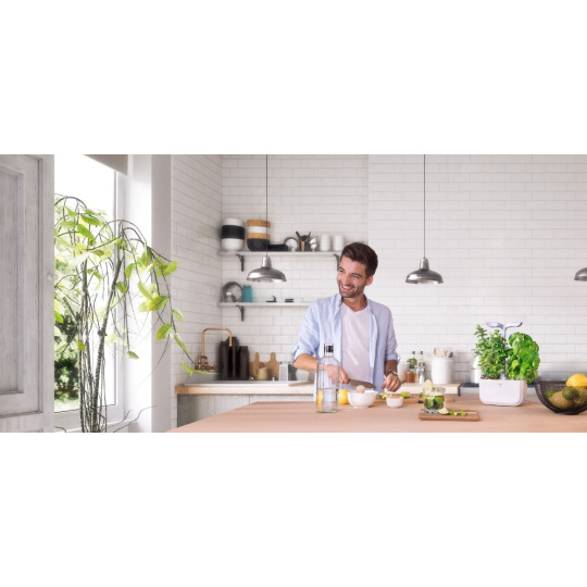 Záhradka Exky Smart sa postará o vaše rastliny automaticky, čo znamená, že dostanú správne množstvo vody a svetla bez vášho zásahu. Integrovaná nádrž na vodu poskytuje až štyri týždne autonómneho zavlažovania, čo je ideálne pre zaneprázdnené jednotlivcov alebo časté cestovateľa. Môžete si užívať čerstvé bylinky, zeleninu a kvety s minimálnym úsilím, zatiaľ čo záhradka pracuje za vás. Spotreba energie záhrady je veľmi nízka, príkon LED je iba 10 W. Vzhľadom k tomu, že zavlažovanie nie je riešené pumpou, záhradka nevydáva žiadny hluk.