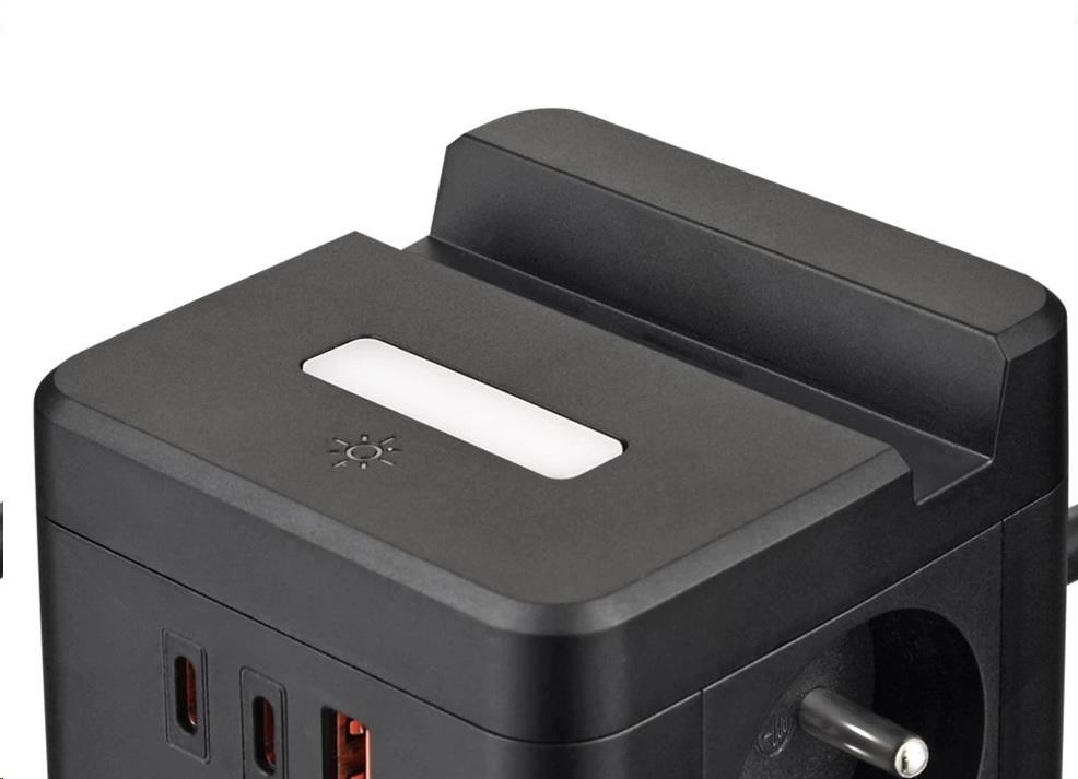 Viking síťový adaptér YC23H, 2x 230 V, 1x USB-A, 2x USB-C, dotykové světlo, funkce stojánku, černá