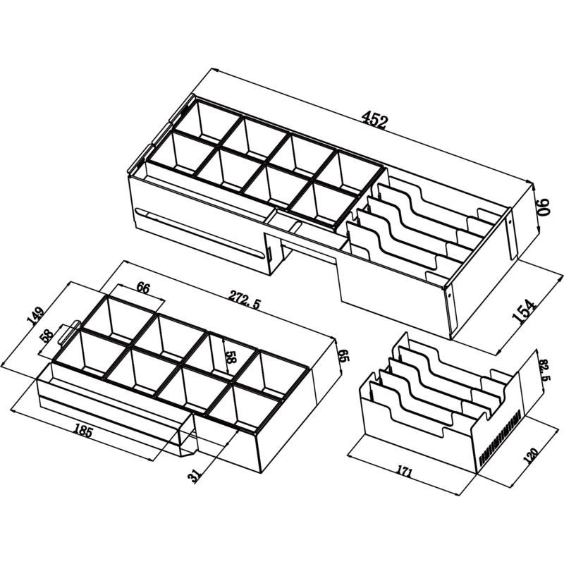 - Vy´jmateľný kovový zásobník na bankovky s plastovými oddelovačmi prihrádok