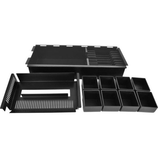 - Vyberateľný kovový priečinok s nastaviteľnými plastovými deličmi priehradiek pre bankovky