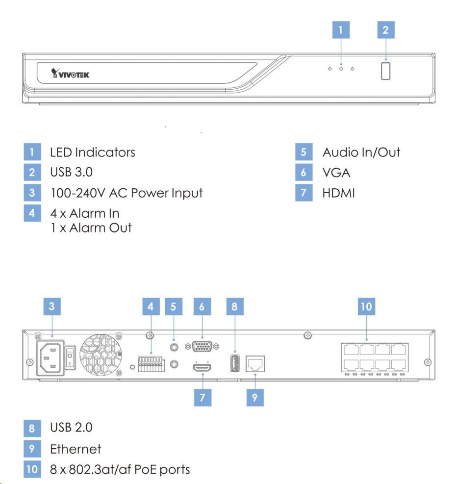NVR podporuje technológiu Smart VCA implementovanú v kamerách, ktorá je založená na technológiách hlbokého učenia (strojového učenia). Umožňuje jednoduché vyhľadávanie záznamov podľa jedného alebo viacerých typov udalostí. Zariadenie je vybavené dvoma portami USB a je kompatibilné s IP kamerami tretích strán podľa štandardu ONVIF Profile S. Prostredníctvom webového rozhrania môžete požiadať technické oddelenie výrobcu VIVOTEK o pomoc vo forme vzdialeného pripojenia k vášmu NVR.