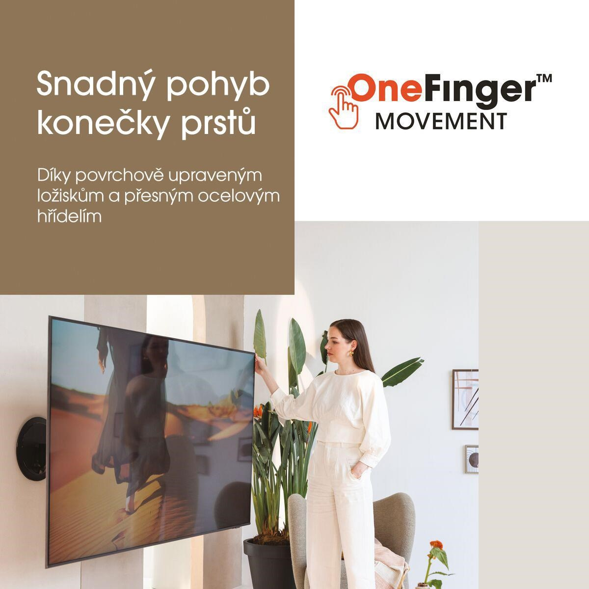 • Snadný pohyb OneFinger™ - vďaka povrchovo upraveným ložiskám a presným oceľovým hriadeľom natočíte TV až o 120 stupňov (platí pre TV do 65").