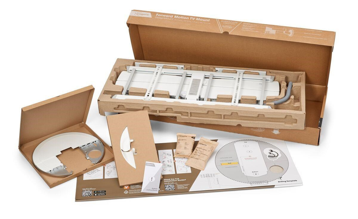 DesignMount sa ľahko inštaluje. Stačí postupovať podľa pokynov v priloženom sprievodcovi rýchlou inštaláciou. Alebo si pozrite podrobný návod a inštalačné video online. Súčasťou balenia je vrtacia šablóna, skrutky a hmoždinky Fischer® DuoPower. Bezplatná aplikácia DrillRight™ AR vám ukáže, ako bude TV vyzerať v konkrétnom interiéri a uľahčí vyznačenie prvého vrtaného otvoru. A po inštalácii môžete televízor ľahko vyrovnať.