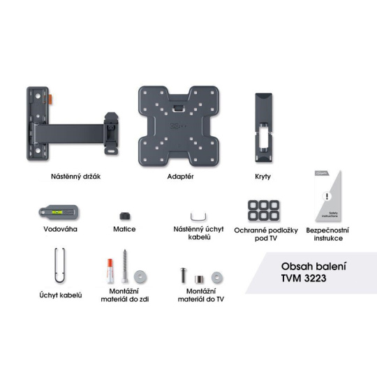 Bezpečnosť, dizajn a pohodlie pri sledovaní TV idú ruka v ruke s držiakom TVM 3223. Držiak je špeciálne navrhnutý pre intenzívne používanie. Je veľmi robustný a zaručuje optimálny zážitok zo sledovania TV. Môžete ho otáčať až o 120° (záleží na šírke TV) a nakláňať o 20° (10° hore a dole). TVM 3223 je vhodný pre televízory s uhlopriečkou od 19 do 43 palcov a hmotnosťou do 15 kg.