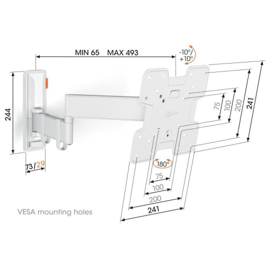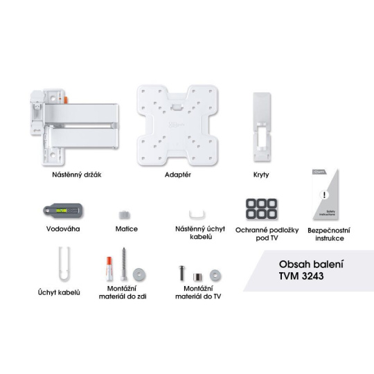 TVM 3243 je štýlový nástenný TV držiak rady COMFORT Full-Motion+ a s ním si vyberáte bezpečnosť, dizajn a optimálne pohodlie pri sledovaní. Držiak je veľmi robustný a vydrží intenzívne používanie. Pretože sa môže otáčať až o 180°, môžete si sledovanie TV vychutnať z akéhokoľvek uhla v miestnosti. Naklápanie je možné až do uhla 20° (10° hore a dolu). TVM 3243 je vhodný pre televízory s uhlopriečkou od 19 do 43 palcov a hmotnosťou do 15 kg.