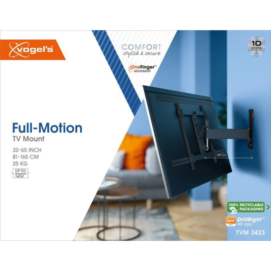 Spoločnosť Vogel's vám inštaláciu držiaka čo najviac uľahčí. Balenie obsahuje vrtaciu šablónu, šrouby, hmoždinky Fischer® DuoPower, stahovacie pásky na káble a vodováhu. Pomocou našej bezplatnej aplikácie DrillRight™ AR App si jednoducho vyznačíte prvý vrt a pokyny k montáži nájdete v stručnom návode na inštaláciu. Alebo si pozrite detailný návod či špeciálne inštalačné video online. So držákom TVM 3423 je zaručená bezpečná montáž televízora. Každý držiak je certifikovaný TÜV a testovaný na trojnásobok jeho maximálnej hmotnosti. Nie nadarmo sa na nástenný držiak televízora COMFORT Full-Motion vzťahuje desaťročná záruka.