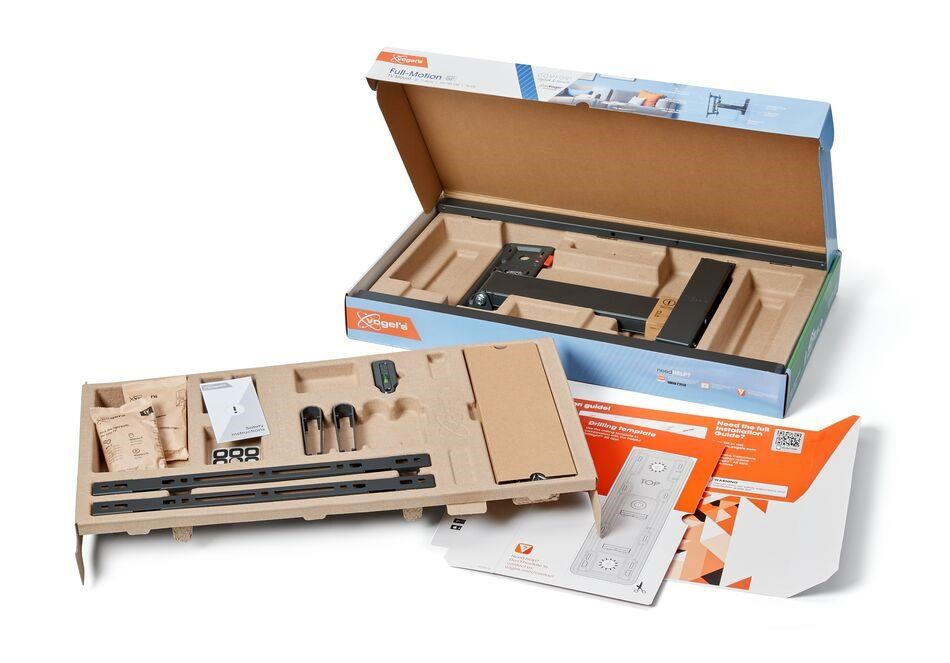 Inštalácia nástenného držiaka televízora COMFORT Full-Motion nie je nijako zložitá. Spoločnosť Vogel's vám ju veľmi uľahčí. Súčasťou balenia je vrtacia šablóna, skrutky, hmoždinky Fischer® DuoPower, stahovacia páska na káble a vodováha. Stačí označiť prvý vrtací otvor pomocou našej bezplatnej aplikácie DrillRight™ AR a v rýchlom sprievodcovi inštaláciou je krok za krokom vysvetlené, ako všetko nainštalovať. Podrobný návod a špeciálne inštalačné video si môžete tiež pozrieť online.