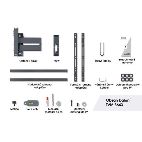Pre bezpečné naklonenie televízora je nástenný držiak vybavený systémom TiltAnchor™, ktorým môžete uzamknúť naklonenie TV. Mäkké podložky na nástennej držiaku chránia zadnú stranu televízora pred poškriabaním počas jeho montáže. TVM 3643 sa ľahko inštaluje. Súčasťou balenia je vrtacia šablóna, skrutky, hmoždinky Fischer® DuoPower, stahovacie pásky na káble a vodováha. Jednoducho si vyznačte prvý vrtací otvor pomocou našej bezplatnej aplikácie DrillRight™ AR. Je váš televízor mierne nakrivo? Žiadny problém. Môžete ho ľahko vyrovnať, a to aj po inštalácii.