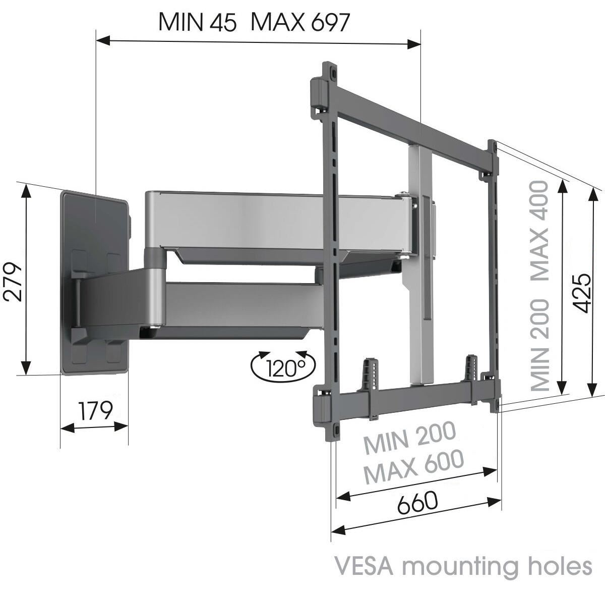Vďaka 69 cm dlhým ramenám má držiak veľký dosah dopredu, takže je ideálny na montáž do skrine alebo niky. Funkcia naklápania bola zámerne vynechaná kvôli ochrane veľkých citlivých obrazoviek. Výhodou veľkých obrazoviek je samozrejme to, že pre skvelý zážitok zo sledovania nie je nutné nakláňať.