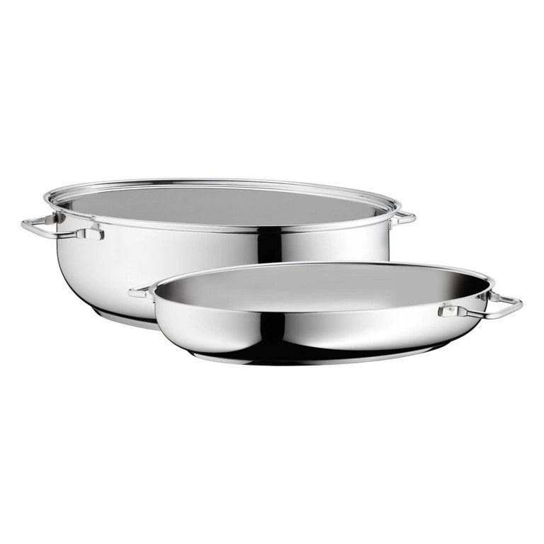 Majster na pečenie, smaženie aj dusenie v jednom balení. Tento priestranný oválny pekáč WMF je nenahraditeľným pomocníkom na prípravu veľkých porcií mäsa, hydiny alebo zapekaných pokrmov. Jeho unikátna konštrukcia 2v1 umožňuje využiť pokrievku ako plnohodnotnú servírovaciu panvicu.