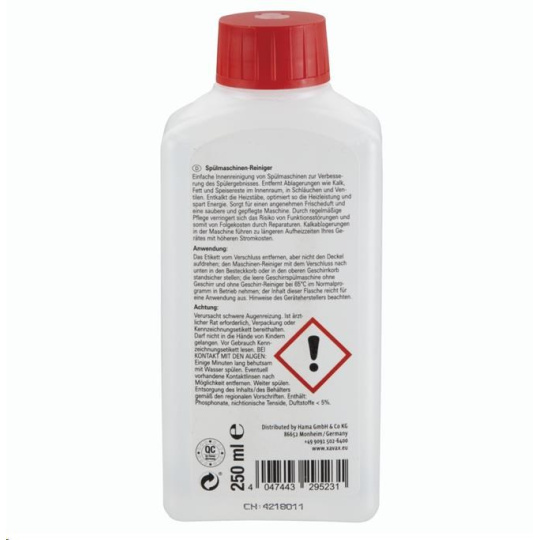 - jednoduché čištění uvnitř myček na nádobí pro lepší výsledky při umývání - odstraňuje usazeniny vodního kamene, mastnoty a zbytky jídla z vnitřku, hadic, trysek a ventilů - odvápňuje ohřívací těleso, čímž optimalizuje výkon a šetří energii - zanechává svěží vůni - objem: 250 ml - vyrobeno v Německu Poznámka pro spotřebitele: Usazeniny vodního kamene způsobují následující: - delší čas ohřevu a tím i vyšší spotřeba elektrické energie = vyšší náklady - náklady na časté opravy Použití: Z uzávěru odstraňte nálepku, uzávěr neodstraňujte. Lahev s čistícím prostředkem postavte uzávěrem dolů do koše na příbory do myčky na nádobí nebo do horního koše na nádobí tak, aby zůstala pevně stát uzávěrem dolů. Prázdnou myčku na nádobí (bez nádobí i bez mycího prostředku) zapněte na běžný program při 65°C. Čistící prostředek je určený na jedno použití..