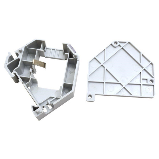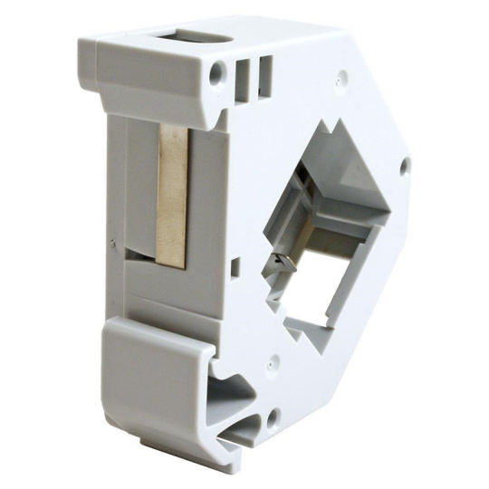 Plastový držiak na 1 lichobežníkový kameň na DIN lištu. Integrovaný kovový pásik zaisťuje uzemnenie lichobežníkového modulu.Štítok pre popis (odnímateľný po odstránení bočného krytu)..