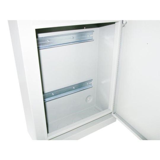 Kovová rozvodná skriňa pre vnútorné inštalácie s DIN lištou. Skrinka je vybavená kovovým zámkom a vetracími otvormi.